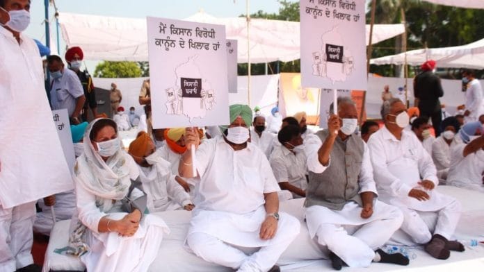 अमरिंदर सिंह, रावत और अन्य यहां नये कृषि कानूनों के खिलाफ धरने पर बैठे.
