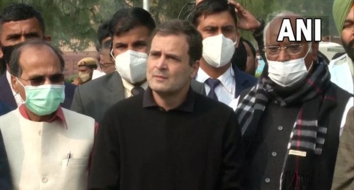 #WATCH | Congress leader Rahul Gandhi joins Opposition’s protest against suspension of 12 Rajya Sabha MPs at Gandhi Statue on Parliament premises in Delhi pic.twitter.com/KYSO4WJZmi