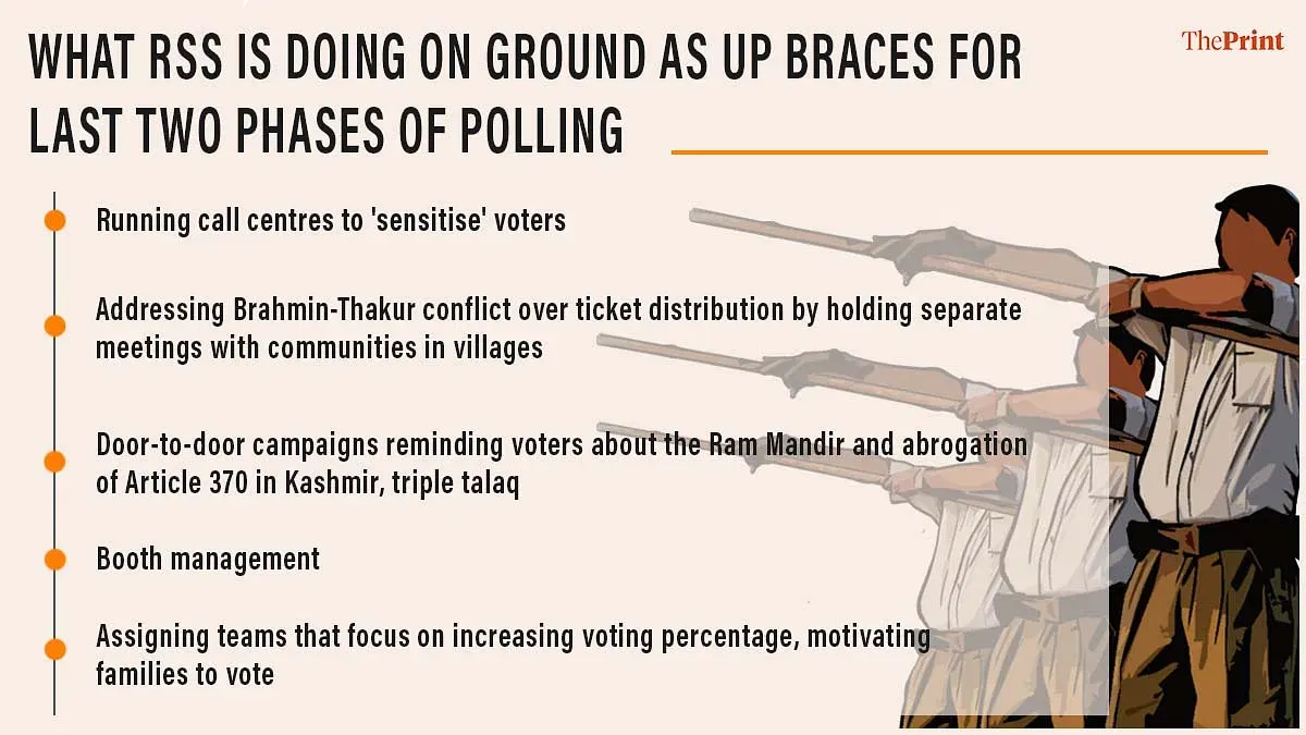 संघ परिवार हर तरीका अपना रहा है. इनमें बूथ प्रबंधन, पोलिंग स्टेशन की सुरक्षा, वोटरों का उत्साह बनाए रखना, क्षेत्र में राष्ट्रवादी मुद्दों को उभारना, पूर्वांचल में ब्राह्मणों की नाराजगी को दूर करने से लेकर विदेशी फंड से चल रहे विपक्षी दलों से वोटरों को सावधान करना शामिल है.