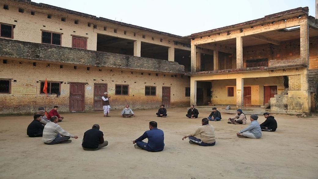 गोरखपुर में सुबह की शाखा के बाद वरिष्ठ अधिकारी नौजवानों के साथ स्थानीय ‘संपर्क’ करते हैं. यह समूह वोटर को पर्चे देता है. यह समूह राम मंदिर, जम्मू और कश्मीर में धारा 370 का हटना, यूपी के धर्मांतरण के खिलाफ कानून और ‘गुंडा राज’ की बात करता है.