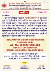 कोरोना के प्रकोप से लड़ने के लिए विश्व हिंदू परिषद् भी आगे आ गया है. इस मुसीबत की घड़ी में वीएचपी ने सभी दिहाड़ी मजदूर, रिक्शा चालक, कुलियों व उनके परिवारों के लिए खाने की व्यवस्था की है. कोई भी भूखा न सोए इसके लिए सहायता केंद्र खोला गया है. वहीं इंद्रप्रस्थ विश्व हिंदू परिषद् ने सभी वर्गों से अपील की है इस घड़ी में जरुरतमंद लोगों की मदद करें. इसके लिए उन्होंने खाता खोलकर लोगों से स्वेच्छा से राशि देने की अपील भी की है.