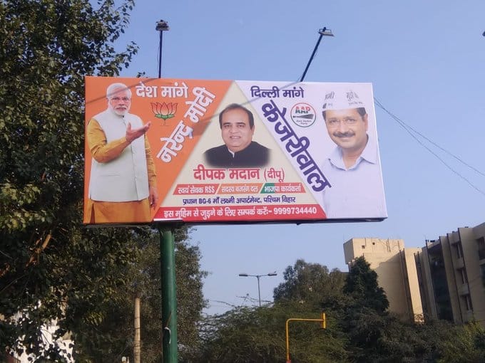 संघ कार्यकर्ता ने मांगा केजरीवाल के लिए वोट, लगाया उनके समर्थन वाला होर्डिंग