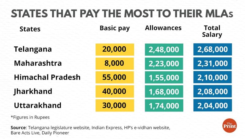 विधायकों के वेतन-भत्तों पर विभिन्न राज्यों के कानूनों के विश्लेषण के साथ-साथ न्यूज रिपोर्टों से पता चलता है कि तेलंगाना (सकल वेतन 2.7 लाख रुपये/माह), महाराष्ट्र (2.3 लाख रुपये), हिमाचल प्रदेश (2.1 लाख), झारखंड (2.08 लाख), और उत्तराखंड (2 लाख रुपये से अधिक) अपने विधायकों को उच्च वेतन-भत्तों का भुगतान करते हैं.
