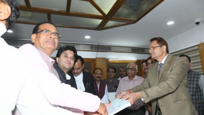 राज्य विधानसभा में सिंधिया के नामांकन के दौरान पूर्व मुख्यमंत्री शिवराज सिंह चौहान, प्रज्ञा सिंह ठाकुर और केंद्रीय मंत्री नरेंद्र सिंह तोमर मौजूद थे.