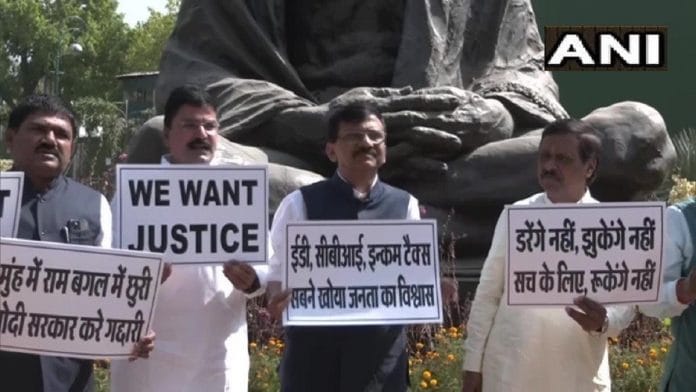 संसद परिसर में गांधी प्रतिमा के सामने खड़े होकर धरना देते हुए राउत ने कहा, ‘महाराष्ट्र जैसे राज्य जो बीजेपी शासित राज्य नहीं है वहां पर केंद्रीय जांच एजेंसियों का दुरुपयोग हो रहा है.’