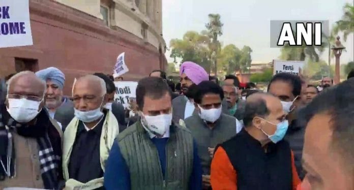 सूत्रों के मुताबिक, विपक्षी दलों के नेताओं एवं सांसदों ने दिन में एक बजे के करीब, संसद परिसर में महात्मा गांधी की प्रतिमा के सामने से मार्च शुरू करके विजय चौक तक गए.