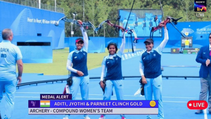 हांगझोउ: भारतीय महिला कंपाउंड टीम ने पिछड़ने के बाद वापसी करते हुए गुरुवार को यहां रोमाचंक फाइनल में चीनी ताइपे को एक अंक से हराकर एशियाई खेलों की तीरंदाजी प्रतियोगिता में दूसरा स्वर्ण पदक सुनिश्चित किया.