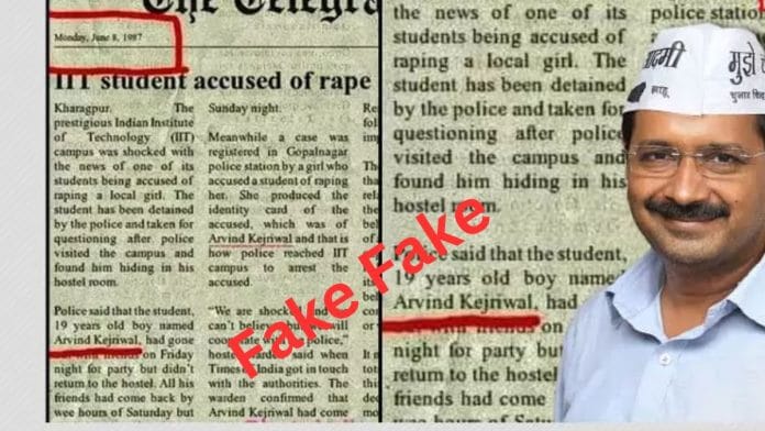कथित तौर पर 8 जून, 1987 को द टेलीग्राफ द्वारा ‘आईआईटी छात्र पर बलात्कार का आरोप’ शीर्षक के साथ प्रकाशित एक अखबार की क्लिपिंग ऑनलाइन फिर से एक बार वायरल हो रही है. रिपोर्ट में दावा किया गया है कि वह छात्र अब दिल्ली का मुख्यमंत्री अरविंद केजरीवाल है. इसमें आगे कहा गया है कि पीड़िता ने केजरीवाल के खिलाफ एक स्थानीय पुलिस स्टेशन में शिकायत दर्ज कराई थी.