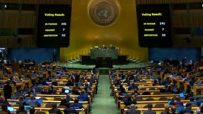 141 members voted in favour of the resolution while 7 opposed it. 32 members including China and India abstained. pic.twitter.com/zvsVZwlNKQ