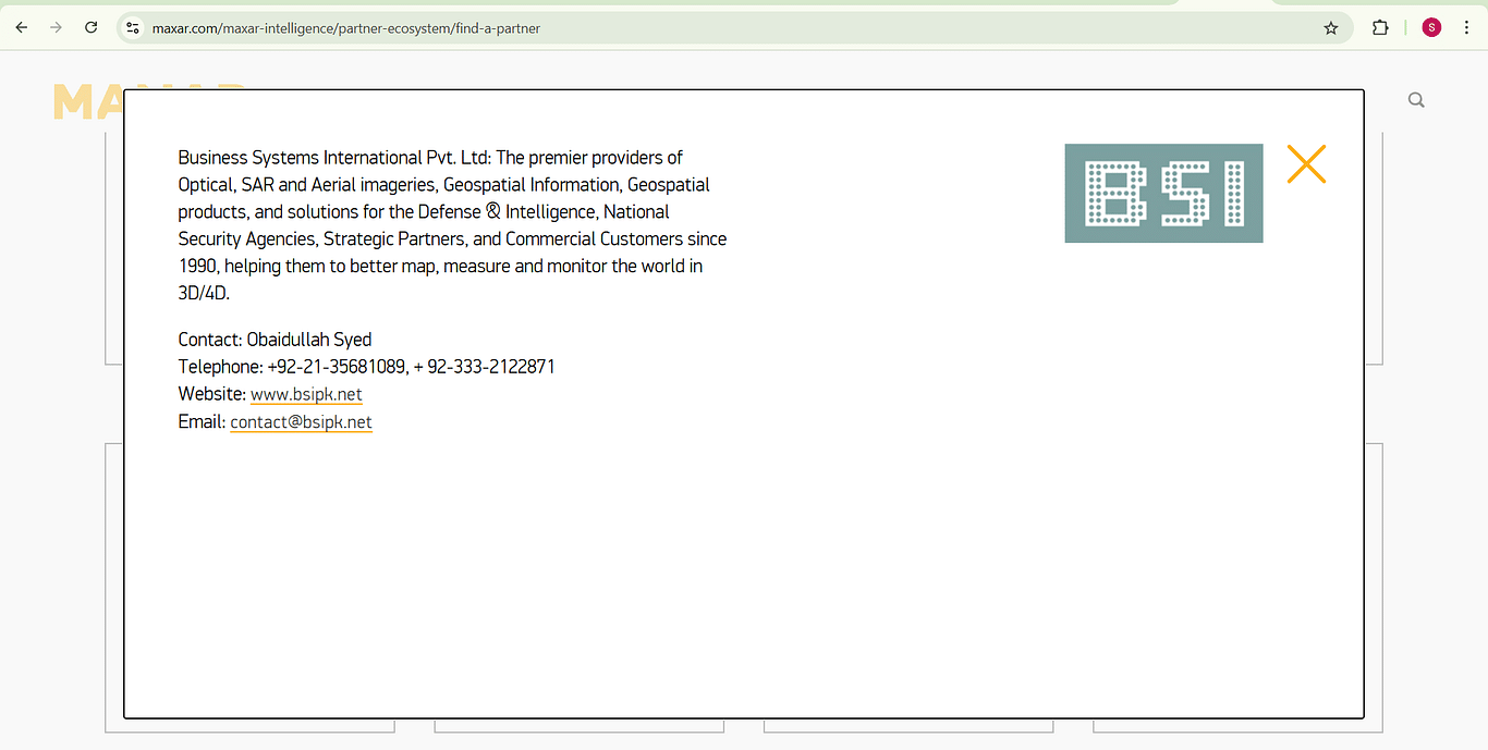 नई दिल्ली: पाकिस्तानी जियोस्पेशियल फर्म बिज़नेस सिस्टम्स इंटरनेशनल प्राइवेट लिमिटेड (BSI) अब अमेरिकी सैटेलाइट कंपनी मैक्सर टेक्नोलॉजीज़ की वेबसाइट पर पार्टनर के रूप में सूचीबद्ध नहीं है.