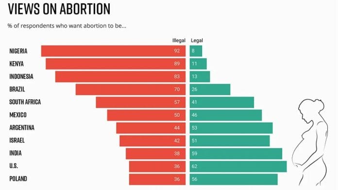 कानूनी गर्भपात को भारत में 59%, अमेरिका में 62% और अधिकांश यूरोपीय देशों में कम से कम 75% का समर्थन प्राप्त है. शोधकर्ताओं का कहना है कि पिछले सर्वेक्षण के बाद से भारत में गर्भपात के लिए समर्थन बढ़ा है.