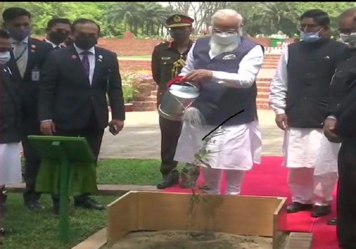 Bangladesh: Prime Minister Narendra Modi plants a sapling at National Martyrs' Memorial in Dhaka. pic.twitter.com/CSmeICexb2
