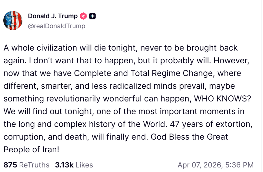 हमलों के कुछ ही देर बाद ट्रंप ने ट्रूथ सोशल पर एक पोस्ट में कहा, “आज रात एक पूरी सभ्यता खत्म हो जाएगी, जिसे फिर कभी वापस नहीं लाया जा सकेगा. मैं नहीं चाहता कि ऐसा हो, लेकिन शायद ऐसा होगा. हालांकि, अब जब हमारे पास पूरी तरह और संपूर्ण शासन परिवर्तन है, जहां अलग, ज्यादा समझदार और कम कट्टर सोच वाले लोग आगे आएंगे, तो शायद कुछ क्रांतिकारी रूप से अच्छा हो सकता है, कौन जानता है?